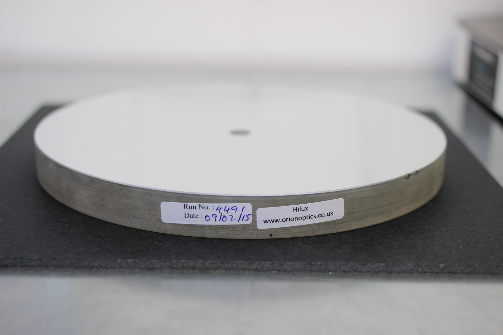 Der Spiegel wurde kürzlich mit einer erweiterten Aluminiumbeschichtung professionell belegt. Die Reflexion liegt im Wellenlängenbereich 400-700nm bei durchschnittlich 94,4% und steigt in der Spitze bis über 97% an.