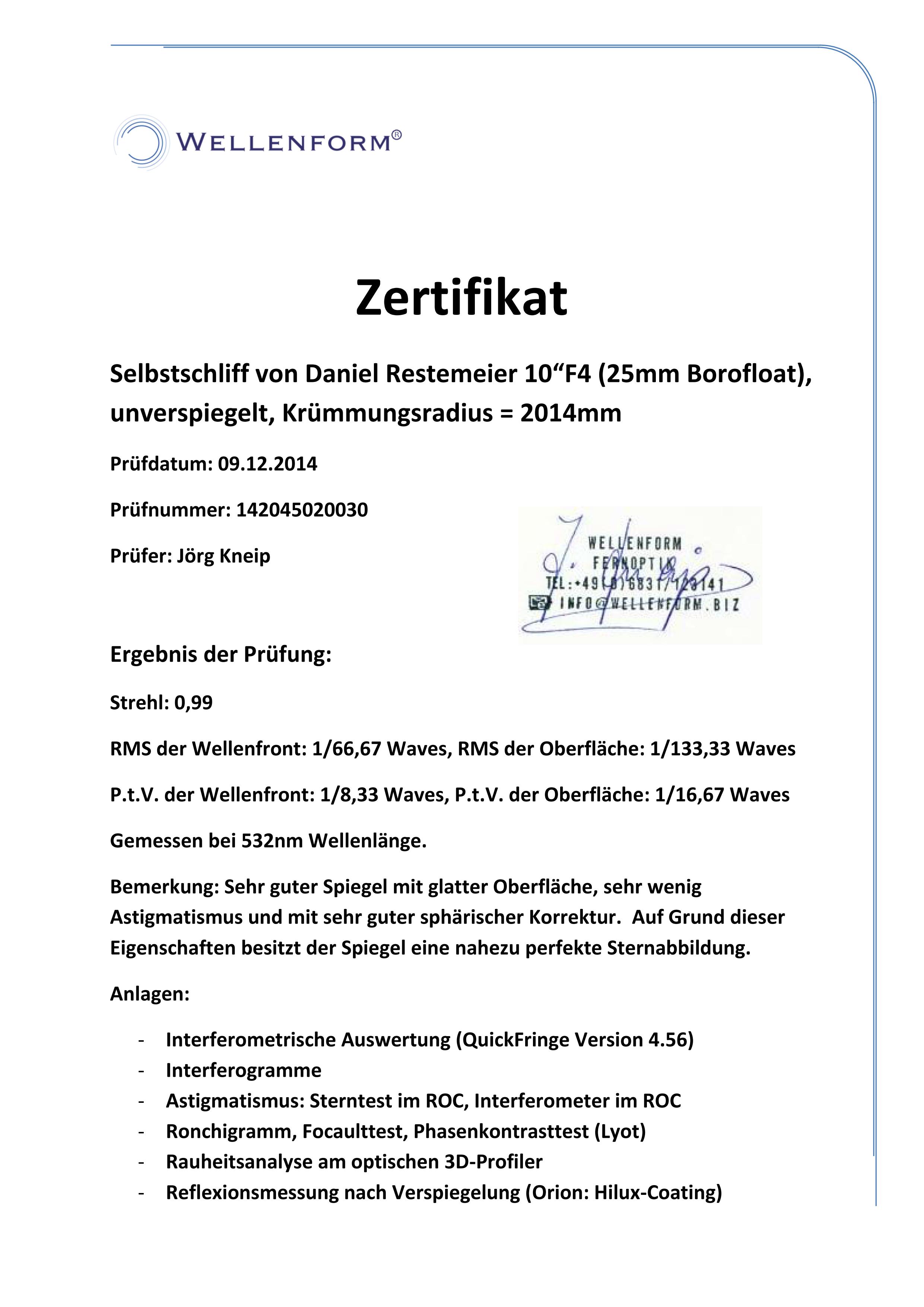 Der Spiegel wurde von Daniel Restemeier, dem Eigentümer der Firma Nauris angefertigt, um seine eigenen Messungen anhand eines extern erstellten Prüfprotokolls zu überprüfen. Zur Messung hat er den Spiegel dann uns überlassen. Wir freuen uns einen so gut gelungenen Spiegel hier auf unseren Seiten anbieten zu können.