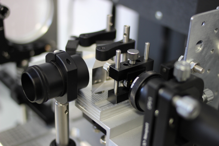 Zwischen verstellbarer Irisblende und dem Strahlteilerwürfel kann ein Filterhalter in den Strahlengang eingesetzt werden. Der Filterhalter kann während der Messung herausgenommen werden, um den Filter zu wechseln. Damit haben wir die Möglichkeit, Optiken ohne grosse Auswirkungen auf die Justage des Messaufbaus, bei engen Bandbreiten und unterschiedlicher Zentralwellenlänge der Beleuchtung, zu vermessen.