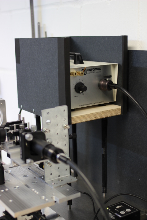 Um Messfehler durch Vibrationen wirksam zu unterdrücken steht der komplette Aufbau auf einer aktiv-schwingungsdämpfenden Plattform von Newport. Aktiv bedeutet, dass die 4 Schwingungsabsorber auf denen die Plattform steht, an ein Druckluftsystem mit konstantem Druck angeschlossen sind. Ein Absorberpaar und zwei einzelne Absorber können Ihren Luftdruck, also ihre Federung, voneinander unabhängig regulieren.