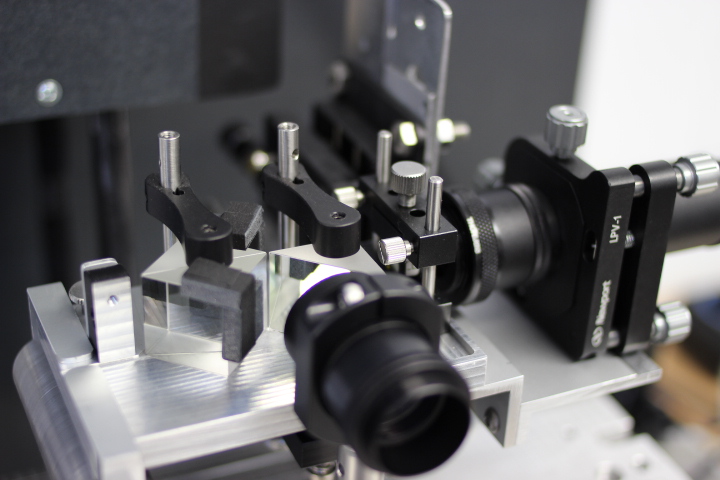 Die Beleuchtungseinheit sitzt auf einem Optikhalter der in 3 Richtungen linear bewegt und um zwei Ebenen gekippt werden kann. Damit wird eine exakte Ausrichtung des Beleuchtungsstrahls zum Interferometeraufbau möglich.