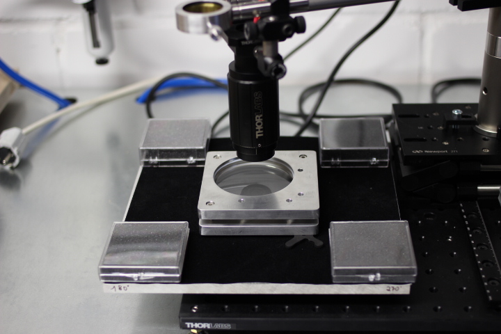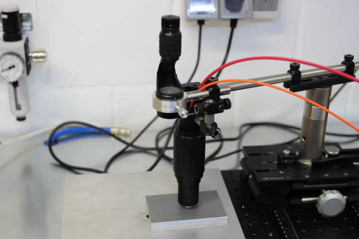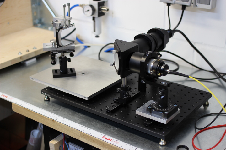 Die Sonde kann im beschriebenen Messaufbau sehr sicher, nah an der Prüfoberfläche positioniert werden. Im folgenden Bild ist die Reflexionsmessung am dielektrisch beschichteten, quadratischen Referenzspiegel von Thorlabs zu sehen.