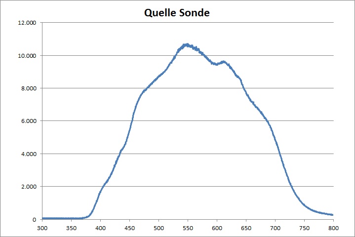Die Kaltlichtquelle strahlt im Bereich 350-800nm. Ihr Spektrum ist sehr homogen und verläuft im visuellen Bereich ähnlich dem Spektrum von Sternen (schwarze Strahler). Für genaue Reflexionsmessungen im visuellen Spektrum von 400-700nm kann die Kaltlichtquelle ausgezeichnet eingesetzt werden.