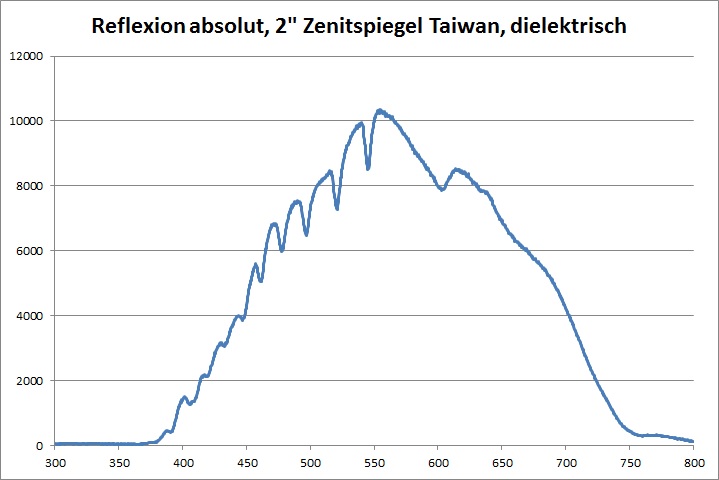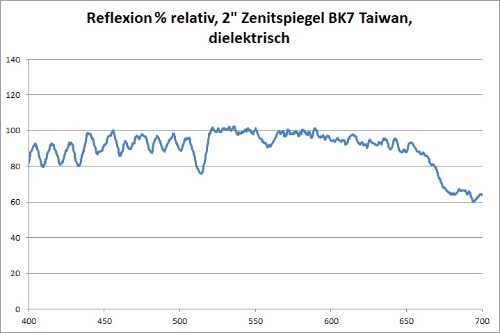Wie die Messungen an beiden taiwanesischen, dielektrisch beschichteten Zenitspiegeln zeigen, ist eine gleichbleibende Qualität der dielektrischen Beschichtung nicht einfach zu realisieren. Die beiden Spiegel hatte ich als Testspiegel für Reflexionmessungen beim Händler neu gekauft. Sie wurden nie zu anderen Zwecken eingesetzt.