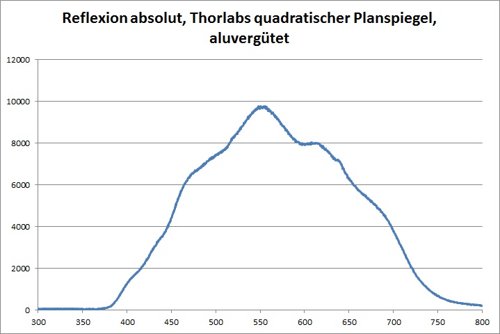 Das Reflexionsspektrum des alu beschichteten Referenzspiegels von Thorlabs ist in der Intensität der Reflexion im Vergleich zum Spektrum der Quelle stärker abgeschwächt. Ansonsten gibt es wie bei der silber beschichteten Referenz keine Auffälligkeiten.
