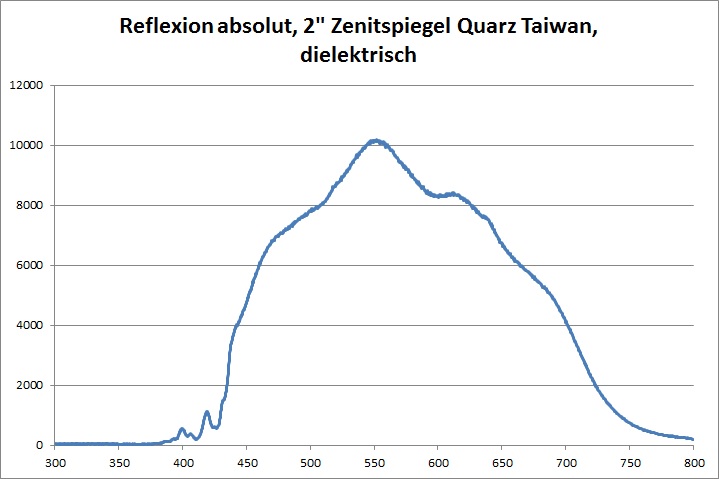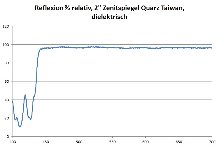 Das Reflexionsspektrum des dielektrisch beschichteten Quarz Zenitspiegels zeigt lediglich am unteren Ende des visuellen Spektrums die gleichen Einbrüche der Reflektivität. Das Intensitätsniveau fällt im Vergleich zur dielektrisch beschichteten Referenz nur leicht ab. Beim Blick in den Spiegel ist nicht mehr Streulicht als bei der Referenz zu erkennen.
