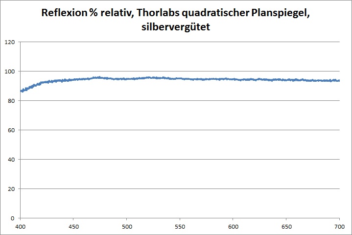 Relativ zum dielektrisch beschichteten Referenzspiegel zeigt der silber beschichtete Referenzspiegel bis 450nm eine deutlich verringerte Intensität der Reflexion. Am oberen Ende des Spektrums, ab etwa 625nm, fällt der Spiegel ein wenig ab. Die Kurven geben die Verhältnisse bei den von Thorlabs veröffentlichten Daten zur Reflektivität der Spiegel gut wieder.