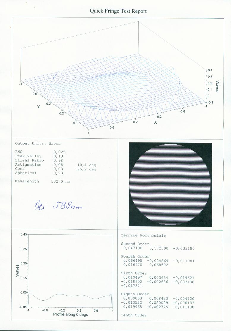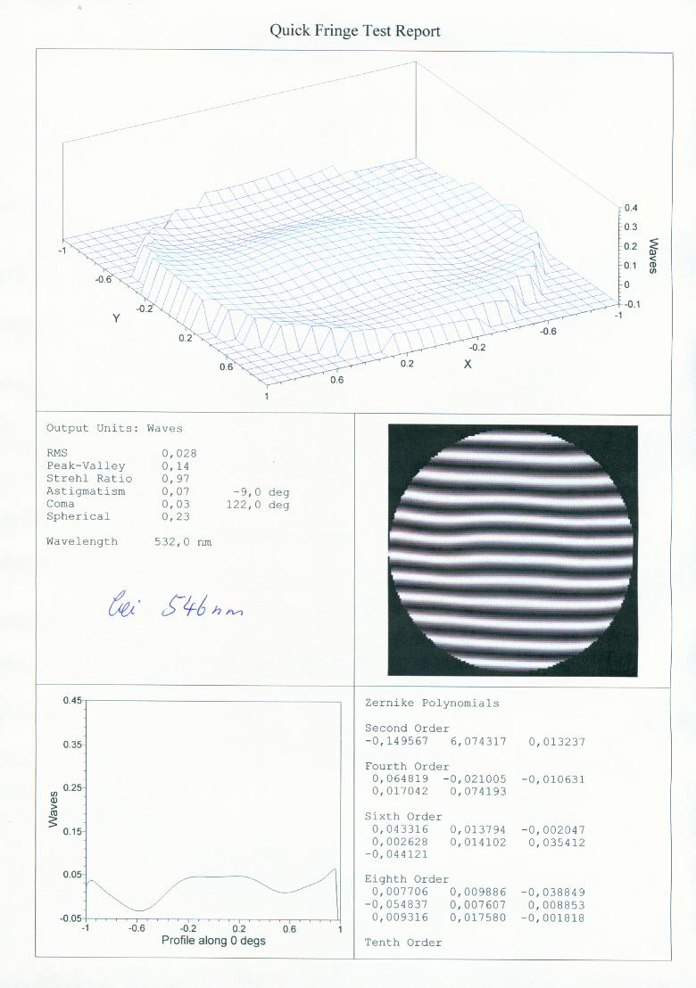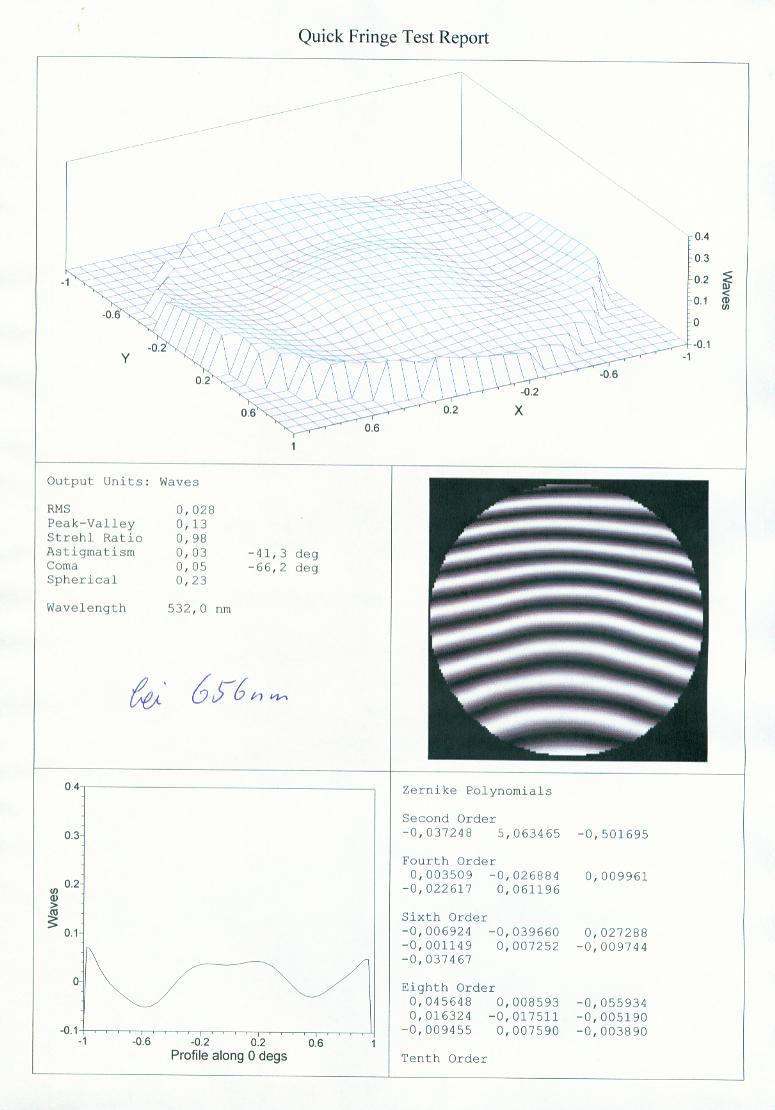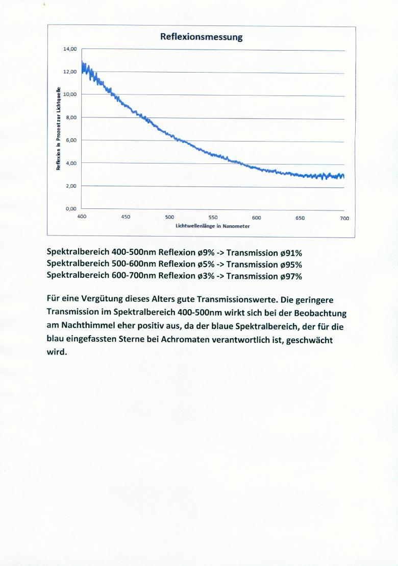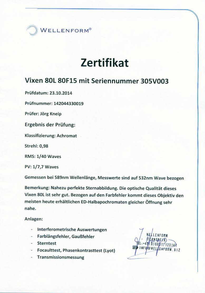 Wie das Zertifikat zeigt, hat dieser Vixen 80L eine extrem gute Optik. Bezogen auf den Farbfehler kommt das Gerät den meisten heute erhältlichen ED-Halbapochromaten mit gleichem Durchmesser sehr nahe.