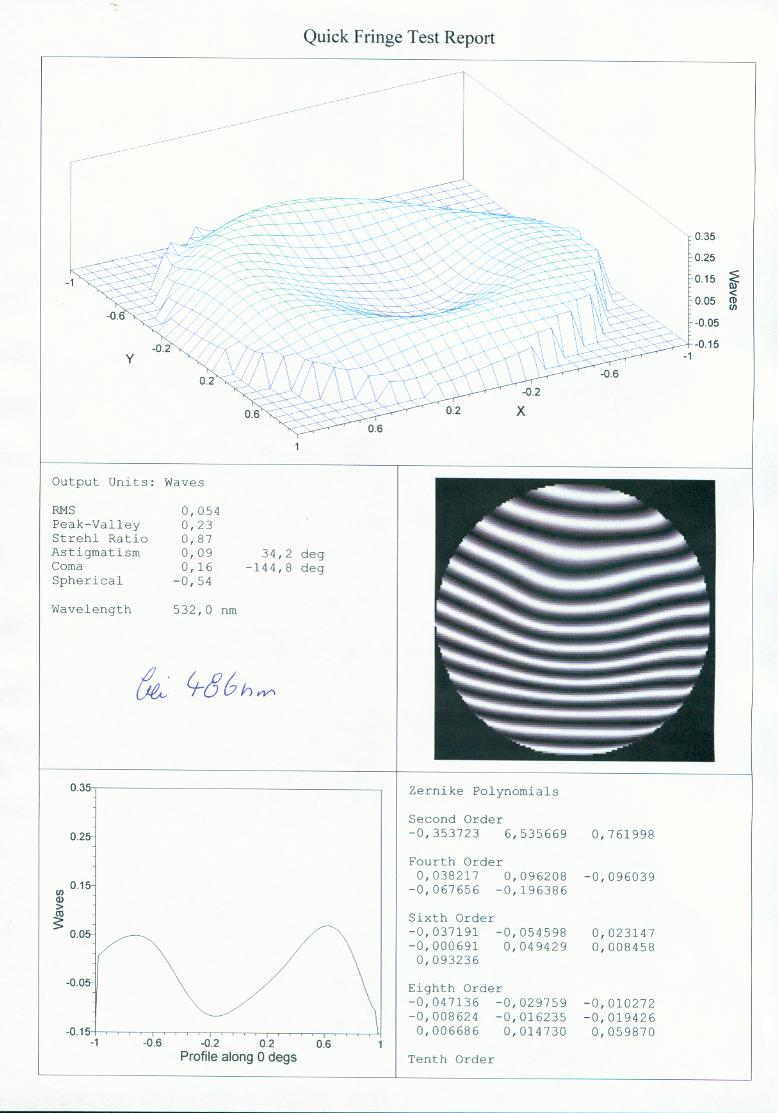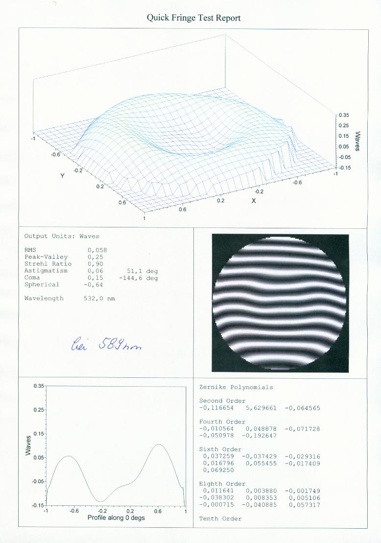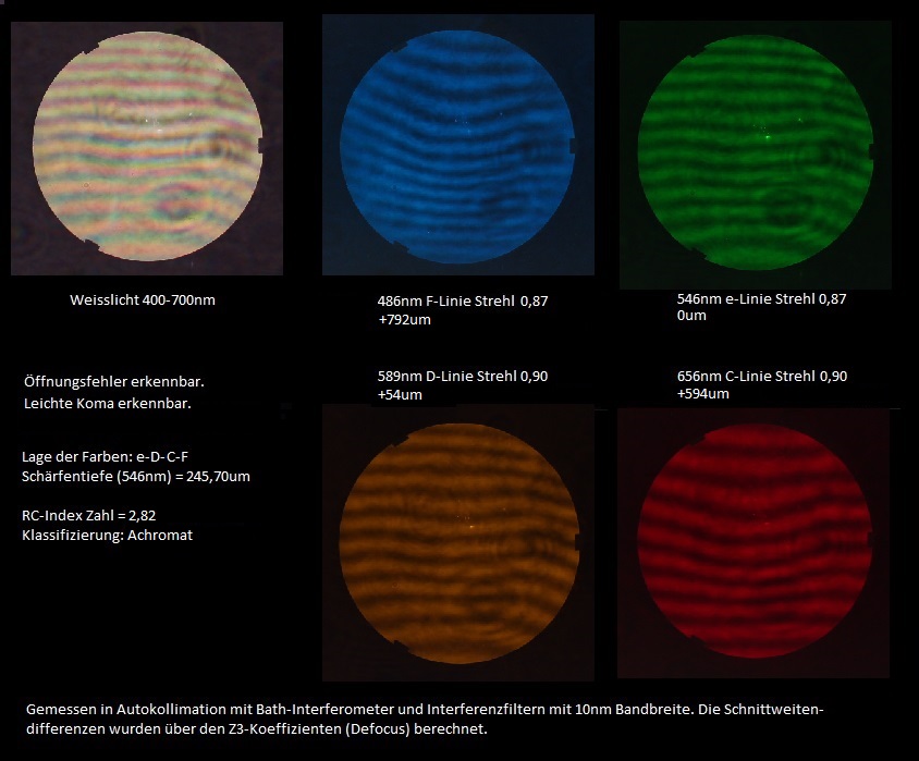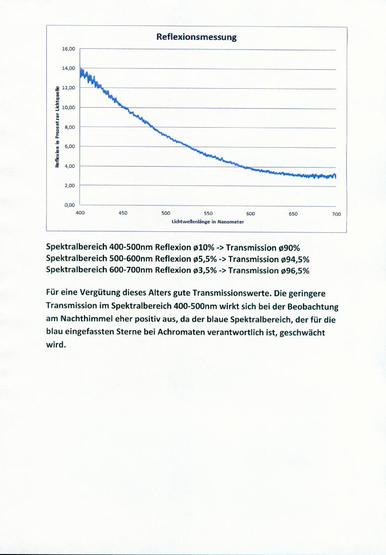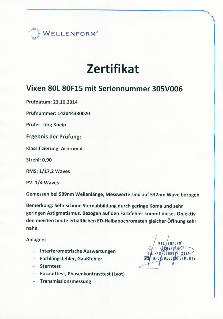 Wie das Zertifikat zeigt, hat dieser Vixen 80L eine sehr gute Optik. Durch die geringe Koma und den sehr geringen Astigmatismus ist die Sternabbildung sehr schön. Bezogen auf den Farbfehler kommt das Gerät den meisten heute erhältlichen ED-Halbapochromaten mit gleichem Durchmesser sehr nahe.
