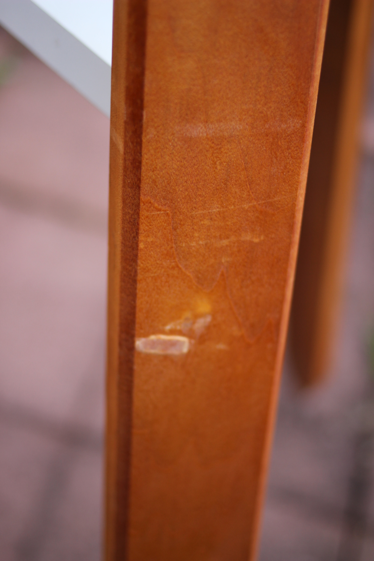Durch den einmaligen Einsatz zu Werbezwecken und eine Umlagerung ist der Lack an der Montierung an einer Stelle leicht abgeblättert. Das Stativ hat ein paar Kratzer abbekommen. Diese Schönheitsfehler sind unten bildlich dokumentiert.